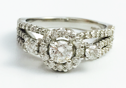 -Our client visited with a diamond stud and halo setting. She wanted the earring to be made into a new ring design. We had just the design in mind and luckily we had a silver stock ring in our window for her to view.